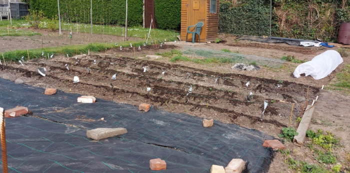 Taking on a neglected patch raised the question of how best to bring the ground back to cultivation. From a previous attempt, my youngest had turned me on to Charles Dowding’s “No-Dig” method, where instead of turning a sod, you plant through a layer of mulch laid on top of cardboard, the idea being to weaken the weeds by starving them of sunlight and for the worms to work the fibrous matter back down into the soil below. But without copious amounts of cardboard the idea evolved so that during February a cubic metre of spent mushroom compost was spread over the wild ground and covered with Mypex membrane. Subsequently, when a bed or row was ready to plant, it was easy to roll up a sheet to reveal relatively weed-free soil.